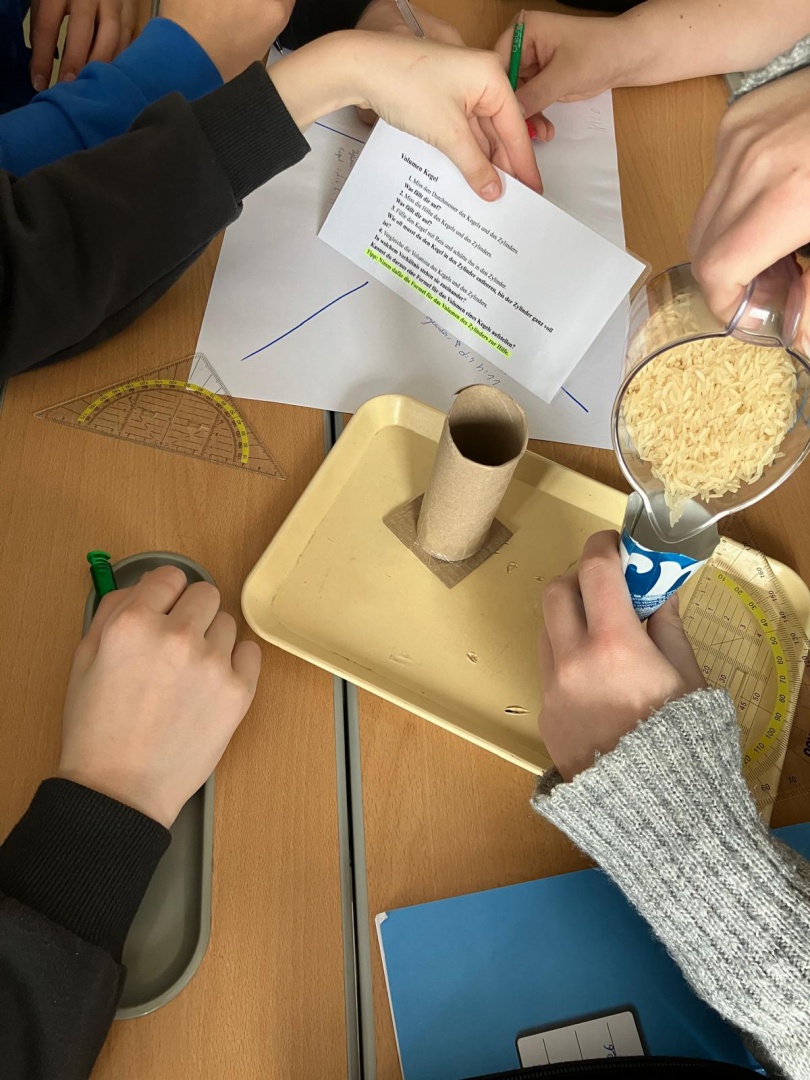 Im Rahmen des Mathematikunterrichts durfte die vierte Klasse die Formel zur Berechnung des Volumens eines Drehkegels eigenständig erarbeiten. Mit viel Neugier und Engagement gingen die Schüler:innen der Frage nach, wie oft ein mit Reis gefüllter Kegel in einen Zylinder passt.