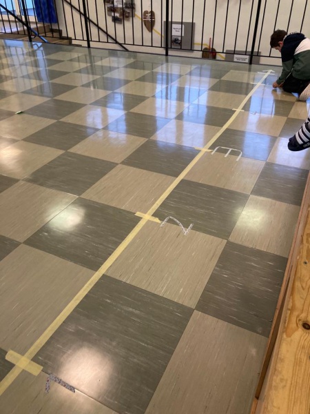 Die zweite Klasse klebte in der Aula ein riesiges Koordinatensystem und bestimmte die Koordinaten der Papierflugzeuge.